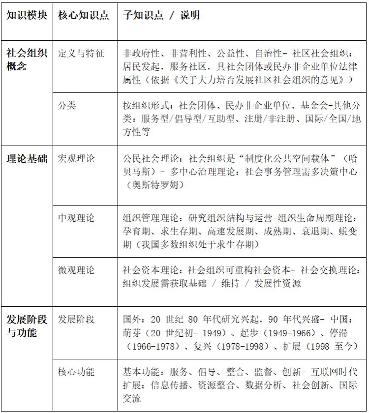 關于校內教育課程資源開發與建設工作,對標社會工作專業本科人才培養方案,擬開發20 門專業核心課程,覆蓋必修與選修模塊。以《社會組織管理》為例,按照項目化教學的理念,將課程內容劃分成十一個項目主題:社會組織管理基礎知識(第一講)、社會組織相關政策法規(第二講)、社會組織愿景使命(第三講)、社會組織公信力與公共關系(第四、五講)、社會組織參與政府購買服務(第六講)、社會組織的財務管理(第七講)、社會組織籌款與資源鏈接(第八、九講)、社會組織內部治理(第十、十一講)、社會組織公益項目設計與展示(第十二、十三講)、社會組織成果提煉與宣傳(第十四、十五講)、社會組織文化營造(第十六講),先課程內容先做知識模塊,再整理出核心知識點和子知識點,以第一講為例,如下表: