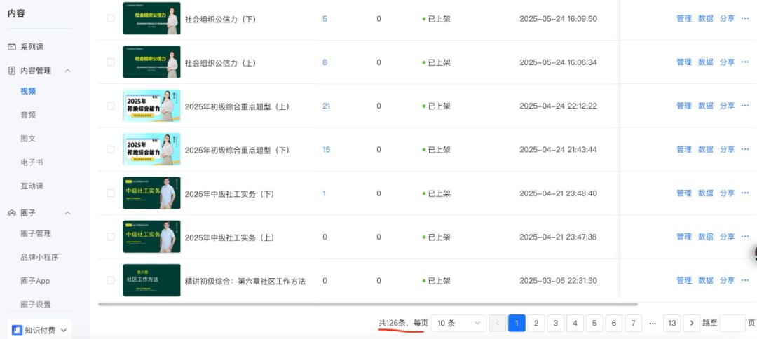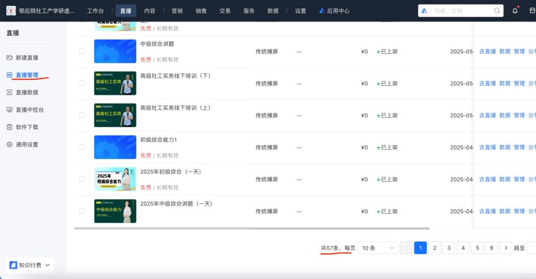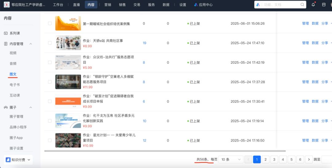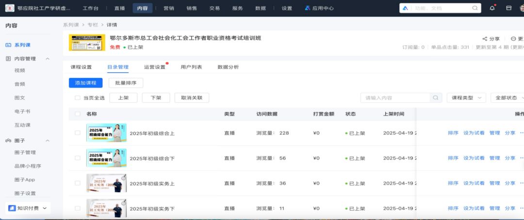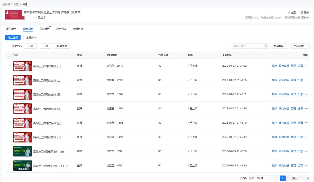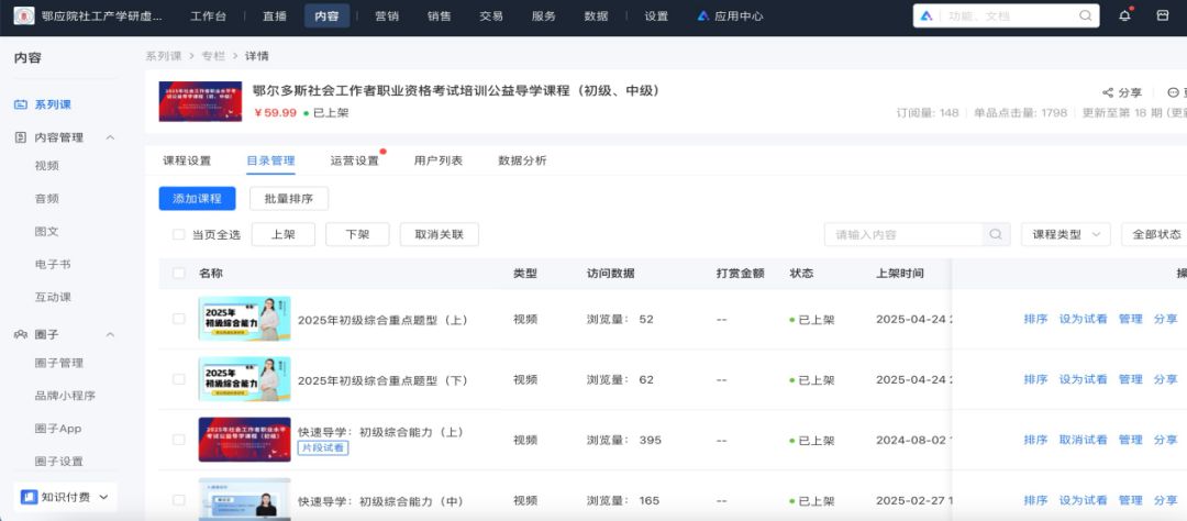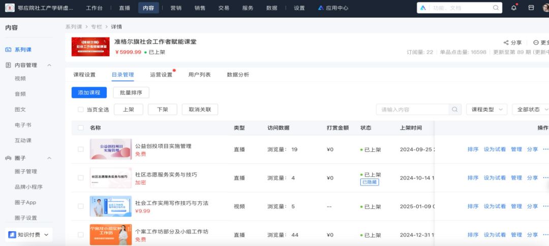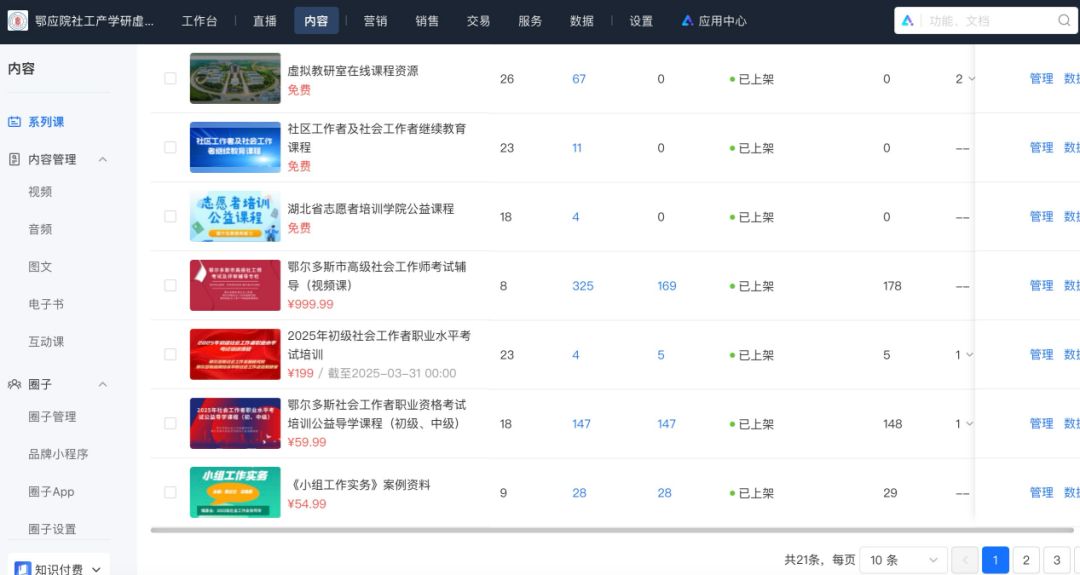 依托小鵝通平臺(https://app8lavfls43563.h5.xiaoeknow.com/),與社工識堂在線教育平臺合作,打造實體化虛擬教研平臺,平臺于2024年8月2日上線,實現 “課程開發、實踐指導、科研轉化、社會服務” 四位一體功能。平臺支持多終端訪問,集成視頻、音頻、圖文、電子書等多模態課程形式,配套全流程教學管理工具,形成 “教 — 學 — 練 — 評” 閉環。目前,平臺已接入校政行社合作單位80多家,匯聚182個共建共享課程資源,覆蓋社會工作、社會組織、社區治理多領域知識模塊。目前搭建課程課程專欄 21 個,開展課程直播及生成回57個,進一步豐富了教學資源與形式。