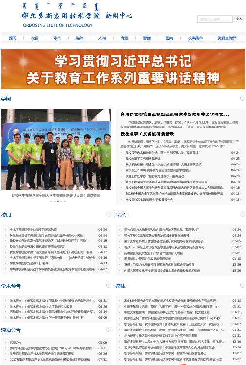 新聞中心網站以白藍兩色作為主色,設計扁平化,界面美觀簡潔。網站下設“要聞”“校園”“學術”“學術預告”“通知公告”“媒體”“人物”“專題”“影像”“圖集”“校媒集萃”等11個二級欄目,方便讀者分類閱讀。同時,網頁突出圖片和視頻效果的呈現,適應“互聯網+”時代的閱讀要求;設置有專題網站鏈接,融合新媒體,進一步豐富了網站內容,可以更好地學習貫徹十九大精神、加強思想政治宣傳教育,充分發揮學校宣傳媒體矩陣優勢,通過多維立體的宣傳方式展示學校蓬勃發展的精神風貌,服務學校對外宣傳。