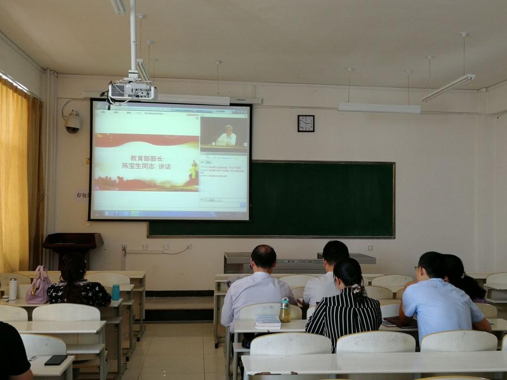 5月14日下午,由中宣部、教育部主辦,教育部教材局舉辦的高校思想政治理論課2018年版教材使用培訓班在北京開班。校黨委副書記秦聞蘋、校領導劉建、蘇美麗,思想政治理論課教師通過網路直播在主教樓401教室集中收看了培訓開班儀式。