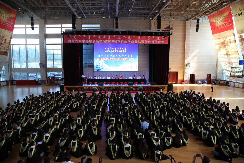 6月30日上午,內(nèi)蒙古大學(xué)鄂爾多斯學(xué)院2018屆學(xué)生畢業(yè)典禮在體育館隆重舉行。鄂爾多斯應(yīng)用技術(shù)學(xué)院黨委書記安勝利、黨委副書記、校長姚德;內(nèi)蒙古大學(xué)副校長張吉維;鄂爾多斯應(yīng)用技術(shù)學(xué)院黨委副書記秦聞蘋,紀(jì)委書記李少東;內(nèi)蒙古大學(xué)黨政辦公室主任蘇振榮、財(cái)務(wù)處處長于化廷、招生辦公室主任段宏利;內(nèi)蒙古大學(xué)交通學(xué)院黨委委員、教務(wù)處處長趙志蒙;原內(nèi)蒙古大學(xué)鄂爾多斯學(xué)院院長查干巴特爾、內(nèi)蒙古大學(xué)鄂爾多斯學(xué)院黨委副書記楊特布信、副院長張荷亮、教務(wù)長劉建出席畢業(yè)典禮并在主席臺(tái)就坐。學(xué)校各職能部門、學(xué)院負(fù)責(zé)人,教師代表,2018屆畢業(yè)生及部分畢業(yè)生家長參加了畢業(yè)典禮。秦聞蘋副書記主持畢業(yè)典禮。