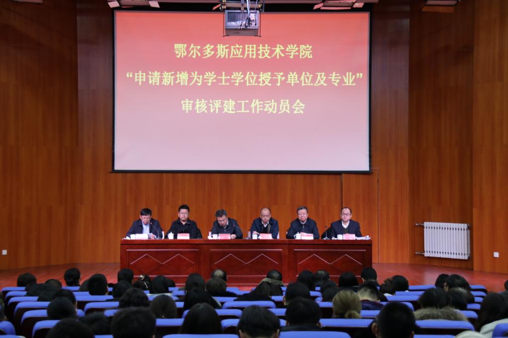 黨委副書記、院長姚德對審核評建工作做動員講話。指出,迎接審核評估意義重大,參會的每一位人員都要從思想上高度重視,堅持對學院、對鄂爾多斯市政府、對自治區人民政府負責的態度,扎扎實實做好每一項工作。強調各部門、單位負責人要切實抓好評建相關文件的學習,研究吃透各項評估指標體系,形成人人關心、人人有責、人人盡職的迎評工作局面。在做好評建工作的同時兼顧好其他各項工作。要堅持以評促建、以評促改、以評促管、評建結合、重在建設的方針,明確各項工作任務目標,對照各項評估指標查漏補缺,確保各項工作不留死角,扎實完成。要把此次迎評促建工作作為對學院各級領導干部的一次大考,全面檢驗干部隊伍的思想覺悟和能力水平。