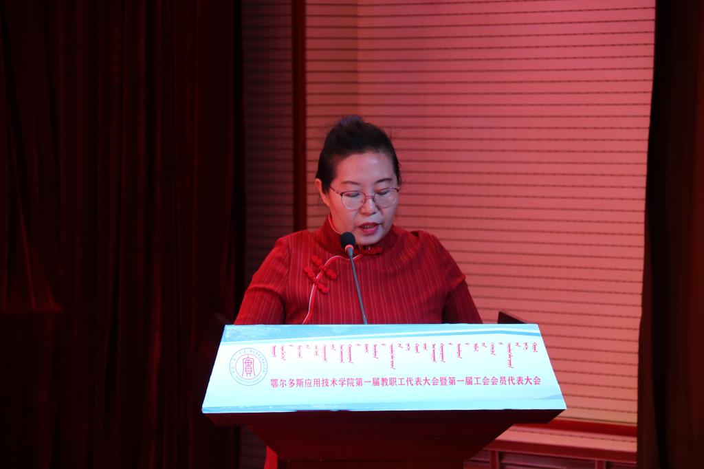 自治區教科文衛體工會主席溫嵐作了講話,她代表自治區教科文衛體工會向本次大會的召開表示熱烈祝賀,向學院廣大教職工和工會會員表示親切的問候。她指出,鄂爾多斯應用技術學院是國家高等教育轉型發展過程中成立的第一所以“應用技術”命名的本科院校,建院以來,各項事業發展取得了可喜成績,學院工會組織緊緊圍繞中心服務大局,為推動學院健康發展發揮了積極作用。溫嵐就學院工會工作提出三點要求,一是要牢牢把握正確的政治方向;二是要與時俱進開展工會工作;三是要不斷加強自身建設,努力開創新時代工會工作的新局面,并表示自治區教科文衛體工會將一如既往地關注和支持學院工會的工作。