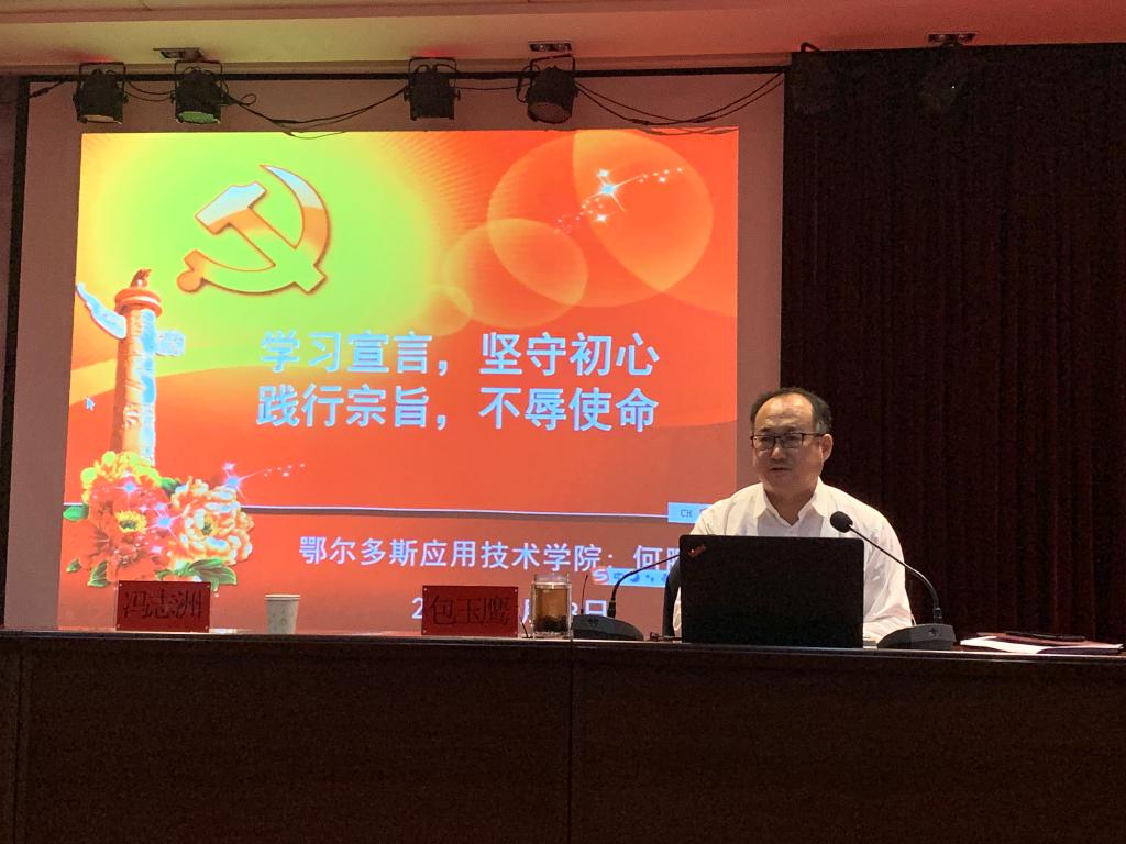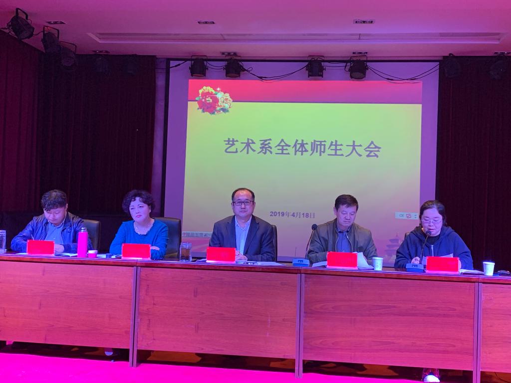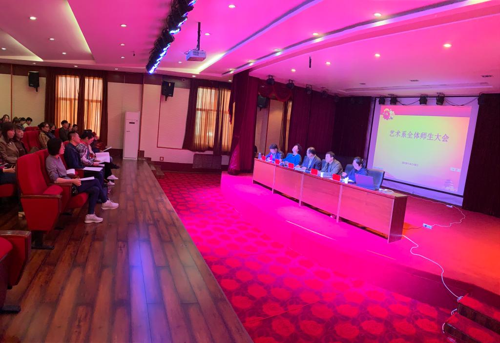 2019年4月18日,藝術系在音樂廳召開全體師生大會,學院黨委委員、副院長何鵬作為藝術系聯系領導,出席會議并為師生們做了題為“學習宣言,堅守初心,踐行宗旨,不辱使命”的黨課講座。會議由藝術系黨總支書記馮志洲主持,藝術系全體師生參加了會議。