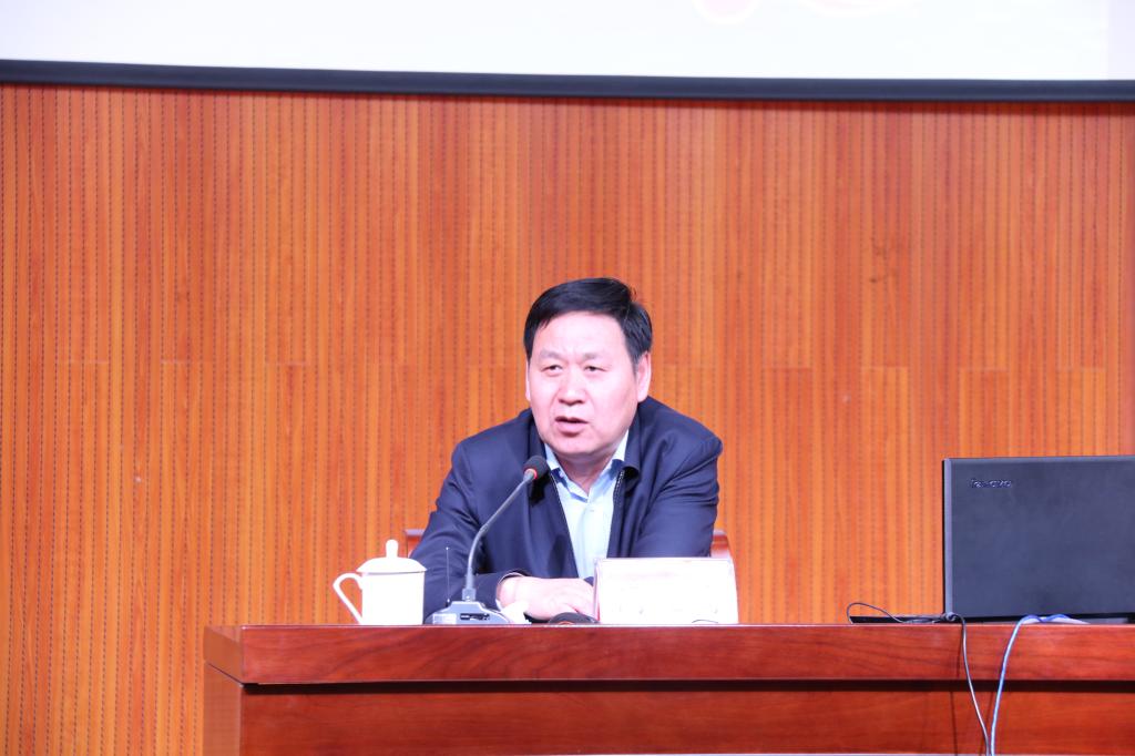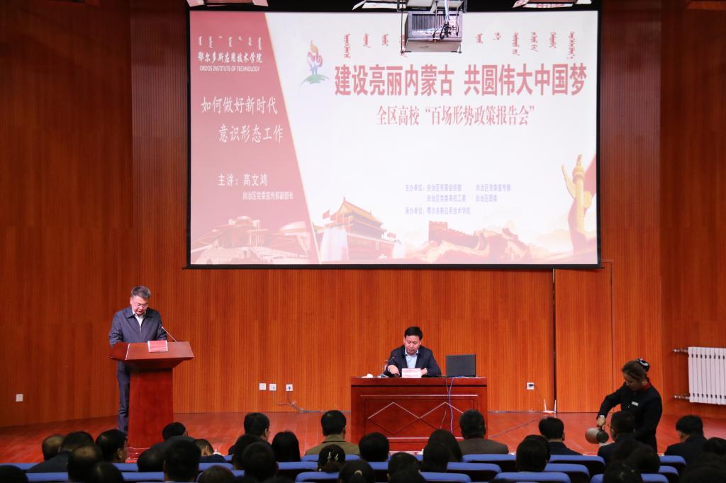 5月14日下午,2019年“建設亮麗內蒙古 共圓偉大中國夢”全區高校百場形勢政策報告會在學院二期報告廳舉行,自治區黨委宣傳部副部長高文鴻應邀為我院干部職工作意識形態工作專題報告。鄂爾多斯市委宣傳部副部長楊雨龍、自治區黨委宣傳部輿情處處長李志、學院領導班子成員出席會議,學院各單位、部門負責人以及300余名教師參加了報告會。參加報告會的還有鄂爾多斯職業學院和鄂爾多斯生態環境職業學院的部分干部教師。報告會由學院黨委書記侯晨曦主持。