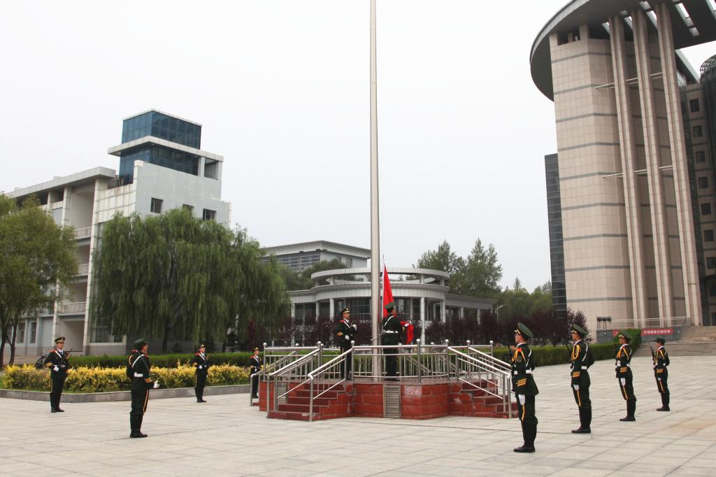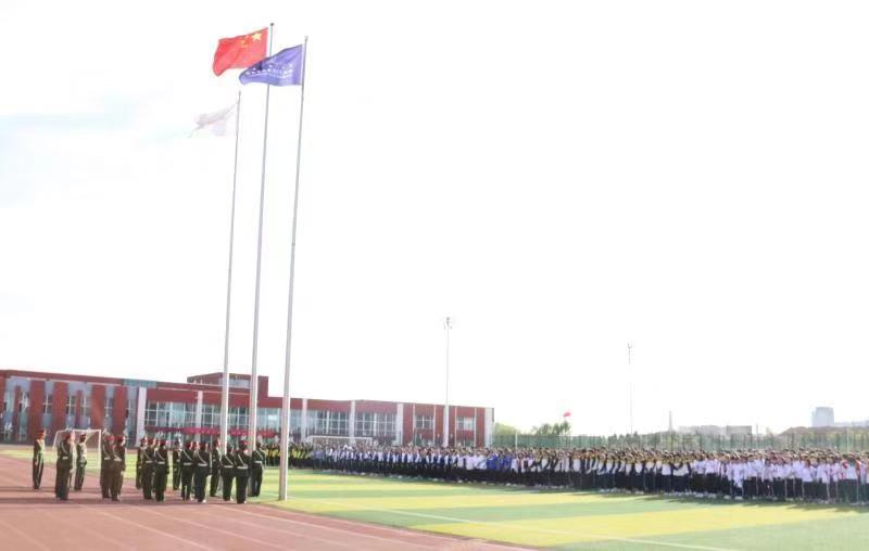 早上7時整,升旗儀式開始。國旗班邁著鏗鏘整齊、堅定有力的步伐護送鮮艷的五星紅旗入場,伴隨著雄壯激昂的國歌,五星紅旗冉冉升起,全體師生高唱國歌,面向國旗行注目禮。