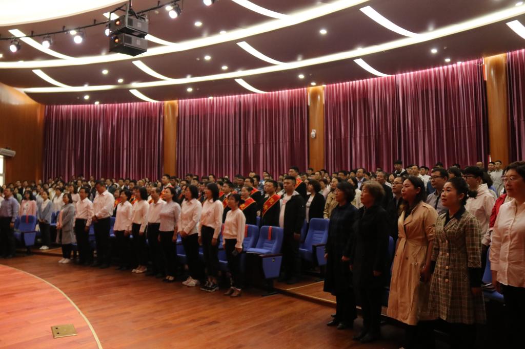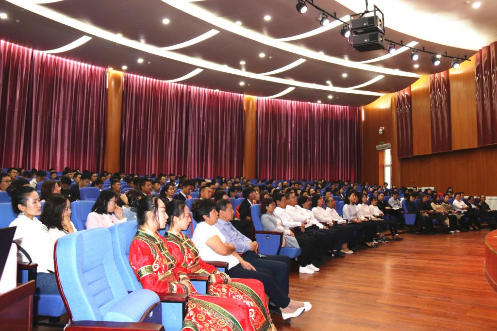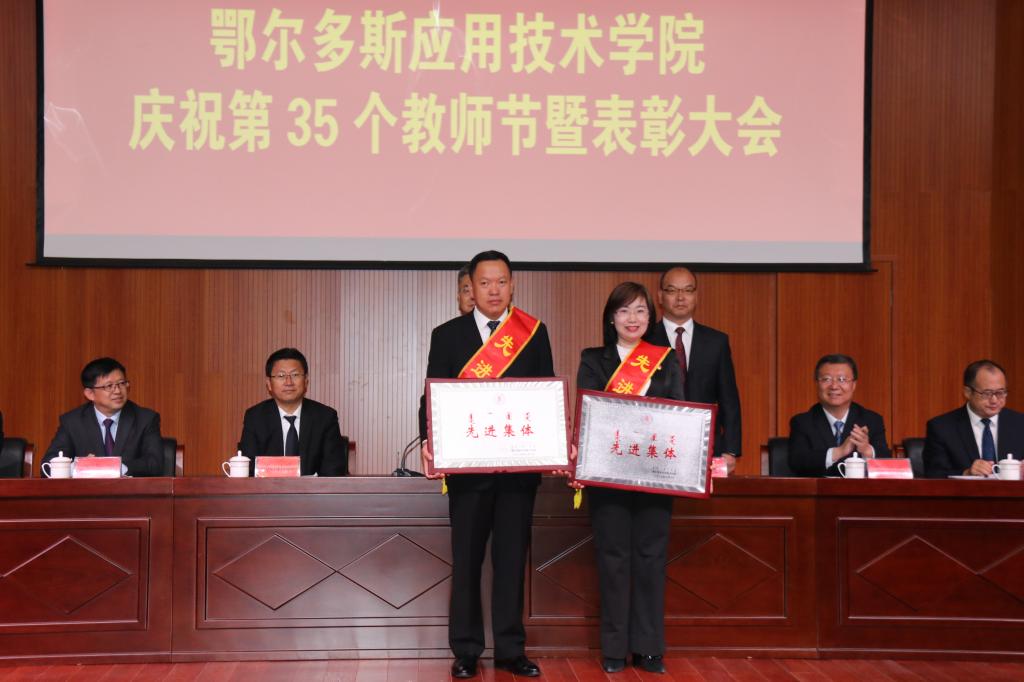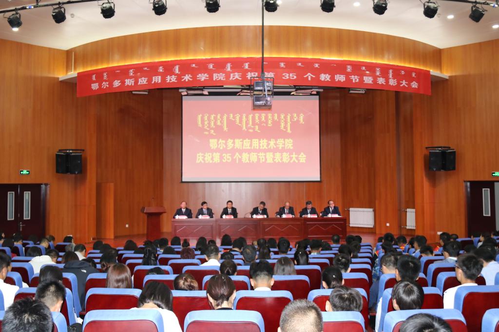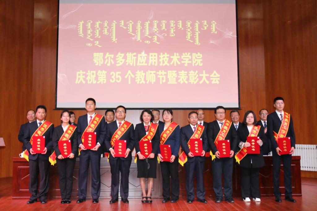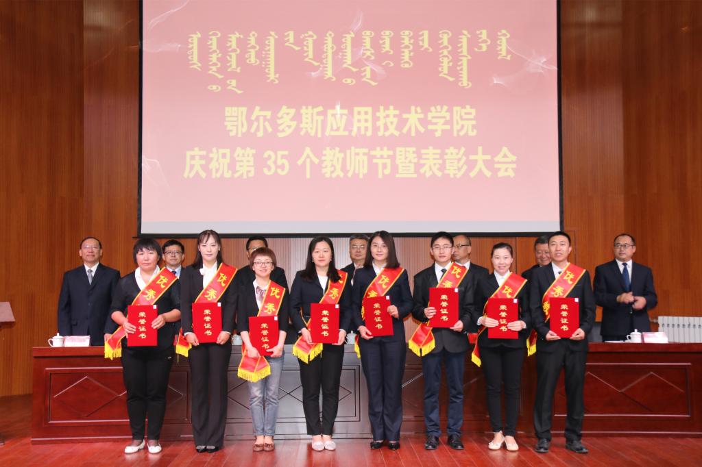 為隆重慶祝中華人民共和國成立70周年和第35個教師節,大力弘揚尊師重教的良好氛圍,進一步激發廣大教職工建功新時代干事創業的積極性、主動性、創造性,推動學院各項事業高質量發展,9月10日我院在康巴什校區學術報告廳隆重舉行表彰大會,對2018-2019年度教育教學中做出突出貢獻的先進單位和個人進行表彰。學院黨委班子全體成員出席表彰大會,全體教職員工及學生代表參加大會。大會由學院黨委書記侯晨曦主持。