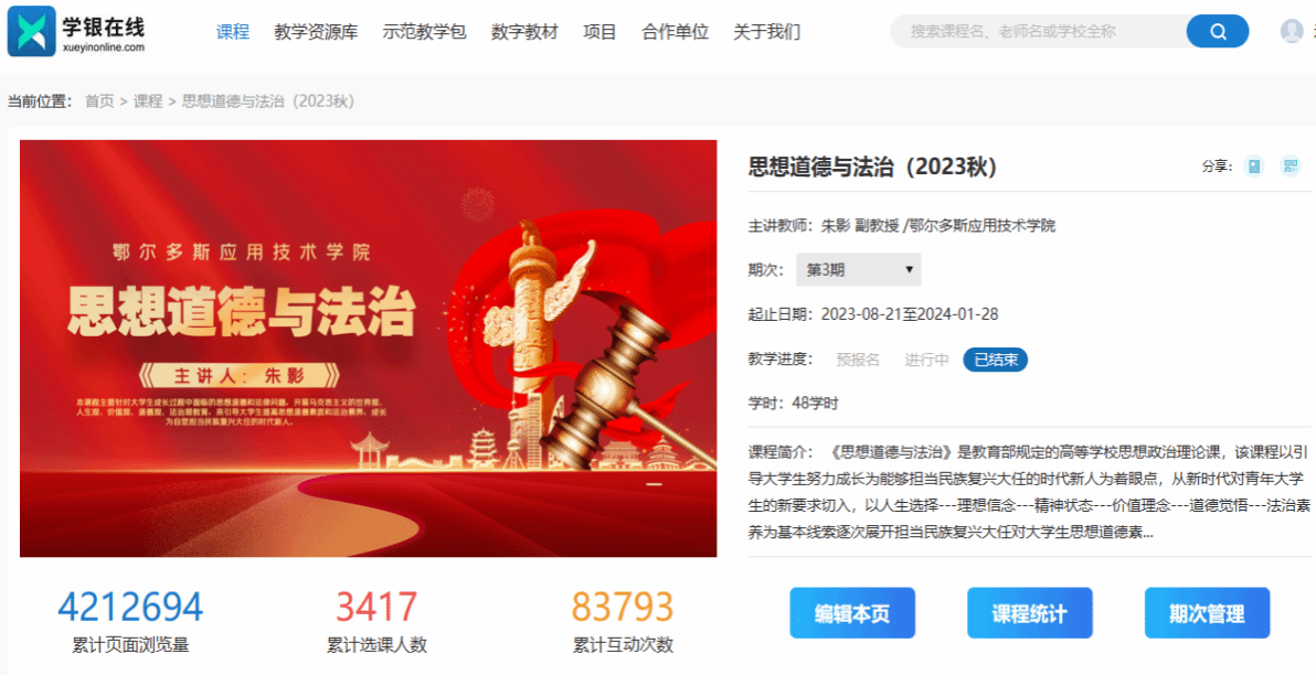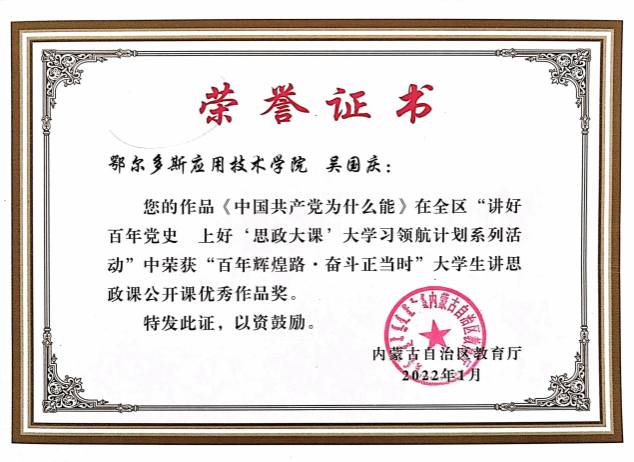 教師團隊在教學改革中建成了5門校級一流課程,1門校級優(yōu)質(zhì)課程,1名教師獲國家民委教育司優(yōu)秀故事案例三等獎,1名教師獲自治區(qū)青教賽思想政治課專項組一等獎,1名教師指導學生獲第九屆中國國際“互聯(lián)網(wǎng)+”大學生創(chuàng)新創(chuàng)業(yè)大賽內(nèi)蒙古賽區(qū)總決賽金獎,1名教師獲全區(qū)高校鑄牢中華民族共同體意識課程“示范性種子教師”稱號,1名教師獲全區(qū)高校鑄牢中華民族共同體意識課程教學資源示范包三等獎,1名教師獲全區(qū)高校鑄牢中華民族共同體意識課程“精品示范微課”三等獎,5名教師在全市大中小學“強國復興有我”思政課大賽中分別獲特等獎1名、一等獎1名,二等獎2名,三等獎2名,1名教師獲鄂爾多斯市青年理論宣講大賽二等獎。