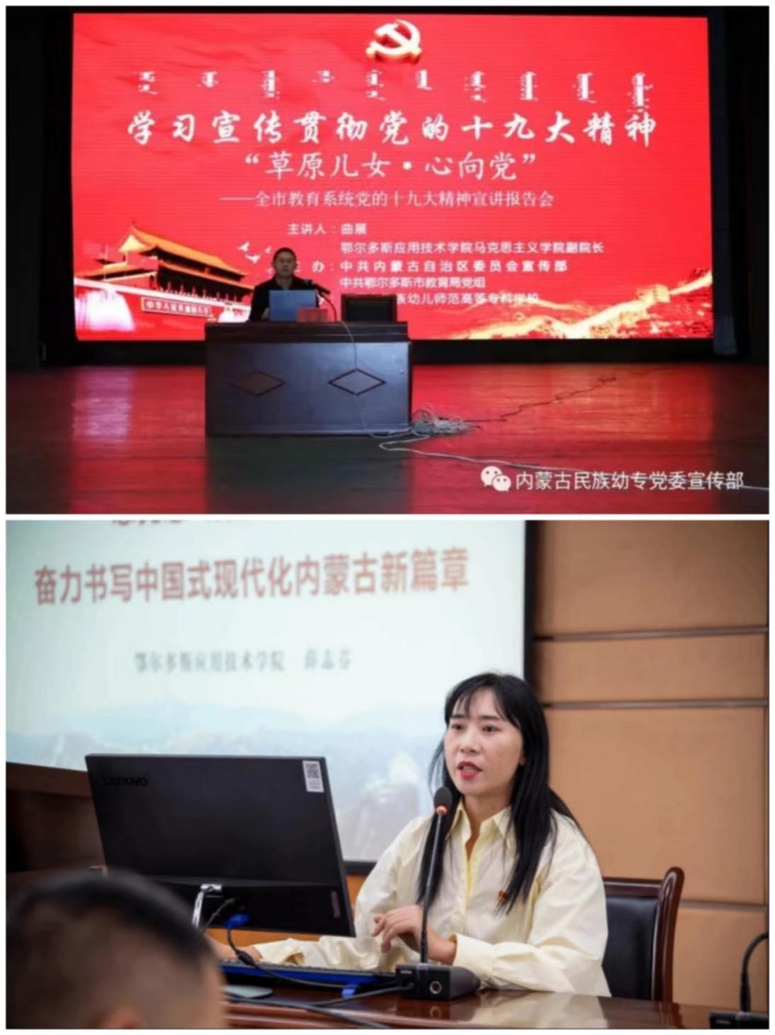 作為黨的理論和黨的政策的學習者、傳承者和傳播者,馬克思主義學院勇?lián)颊n教師的責任與擔當,積極為中小學、社區(qū)、市直機關等單位開展“鑄牢中華民族共同體意識”“六句話的事實和道理”等主題教育宣講活動,教育引導廣大居民銘記歷史、深刻學習領會習近平總書記交給內(nèi)蒙古的“五大任務”和全方位建設模范自治區(qū)兩件大事,進一步傳承感黨恩、聽黨話、跟黨走的紅色基因。