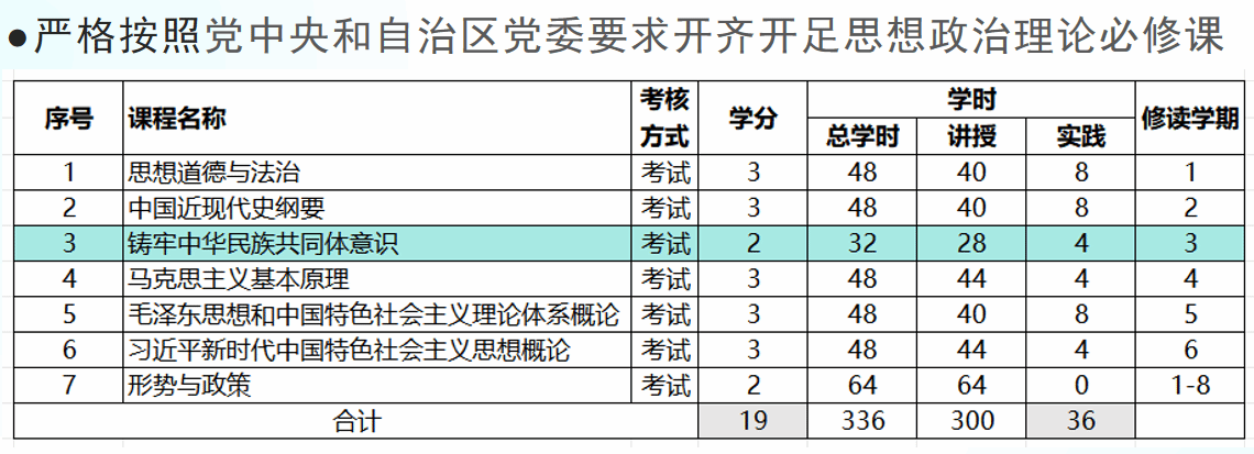 學校嚴格按照黨中央和自治區(qū)黨委要求開齊開足思政必修課。開設了思想道德與法治、中國近現(xiàn)代史綱要、鑄牢中華民族共同體意識、馬克思主義基本原理、毛澤東思想和中國特色社會主義理論體系概論、習近平新時代中國特色社會主義思想概論、形勢與政策等7門課程,共19學分。在教學中,嚴格執(zhí)行學校人才培養(yǎng)方案,保障思想政治理論課的教學時數(shù)。
