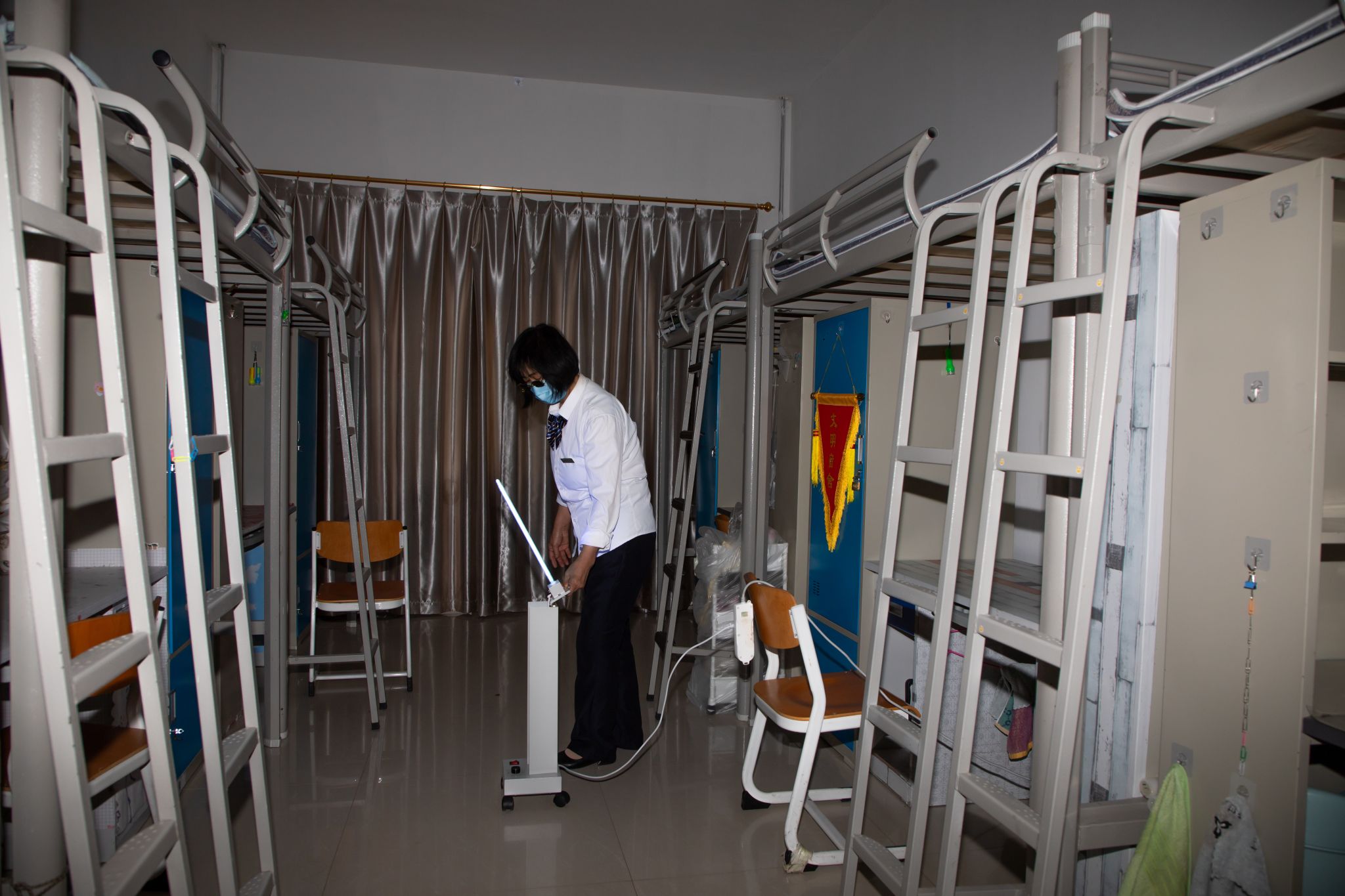 這學期,學校購進一批紫外線消毒燈,對所有宿舍進行全面徹底消毒。這種新型消毒方式不僅效果好、效率高,而且避免了消毒水造成的過敏和物品留漬,貼心又細心。