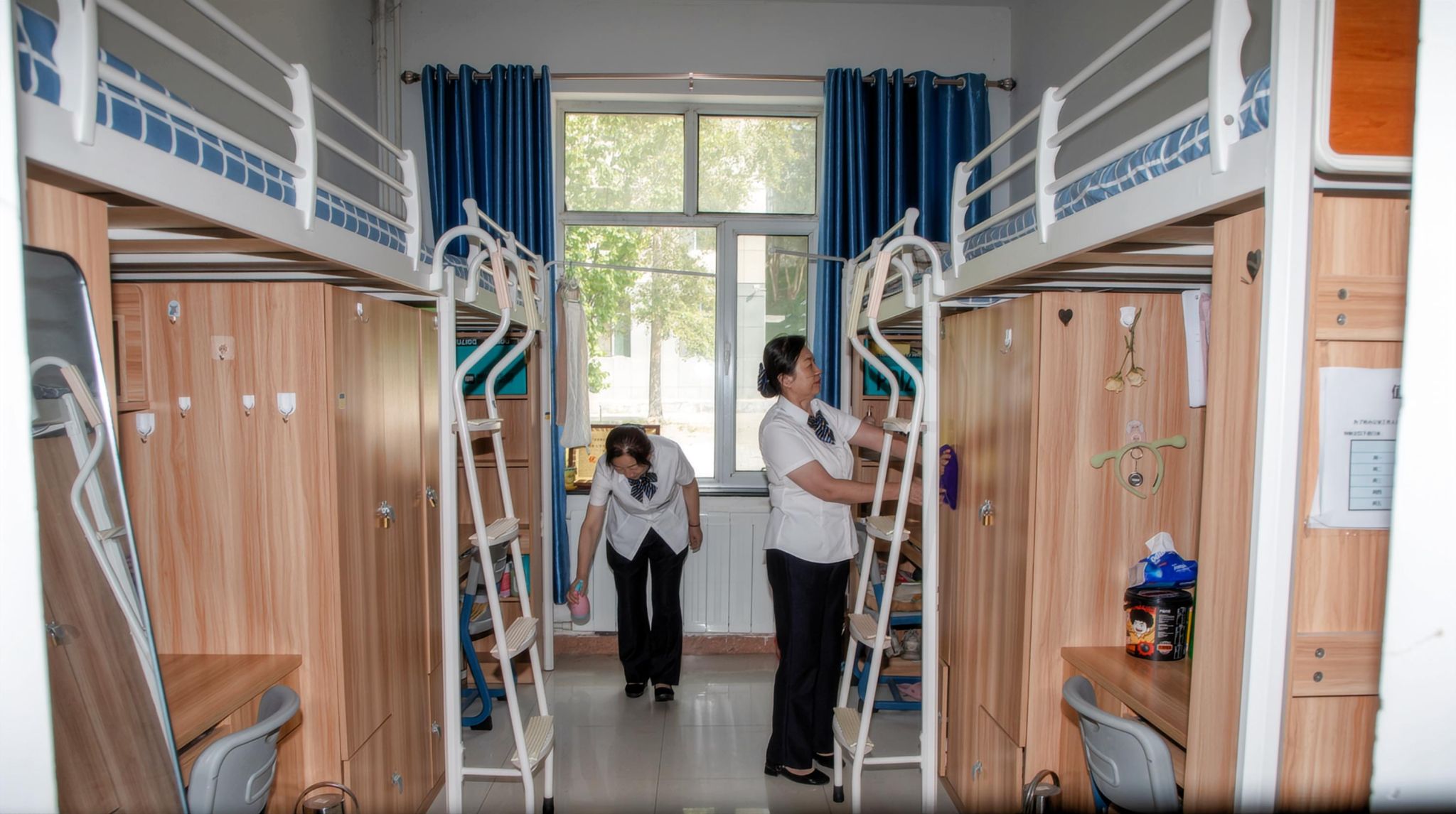 當然,開窗通風、灰塵擦拭這些傳統清掃方式一樣都沒少,宿管阿姨提前到崗值班,只為讓每一位鄂小鷹感受回家的“溫暖”。