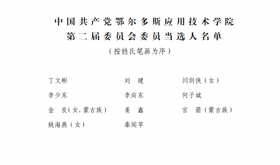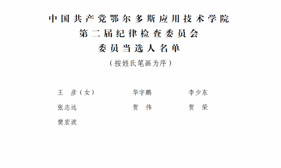 在總監(jiān)票人梁建華的主持下,大會選舉產(chǎn)生了中國共產(chǎn)黨鄂爾多斯應(yīng)用技術(shù)學(xué)院第二屆委員會和中國共產(chǎn)黨鄂爾多斯應(yīng)用技術(shù)學(xué)院第二屆紀(jì)律檢查委員會。11人當(dāng)選新一屆黨委委員,7人當(dāng)選新一屆紀(jì)委委員。