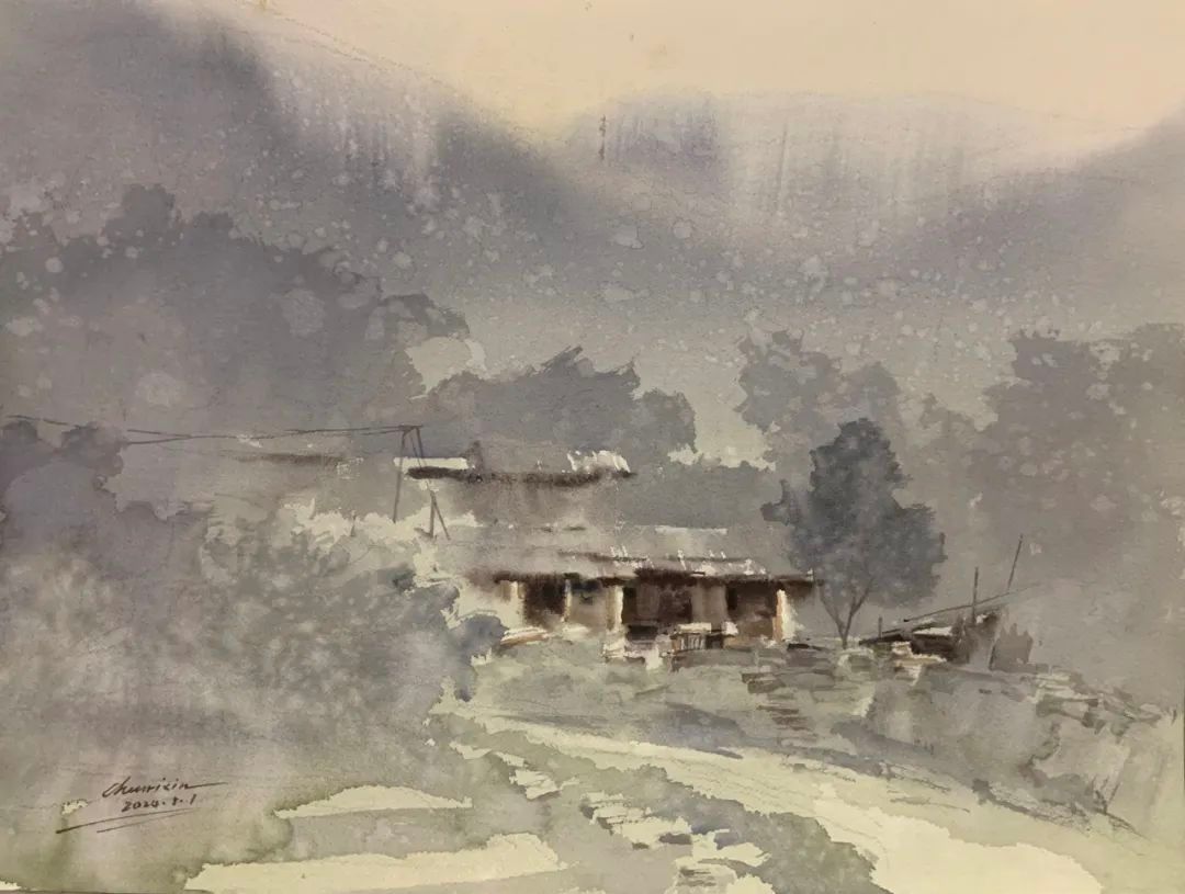 《山村晨霧》(水彩)