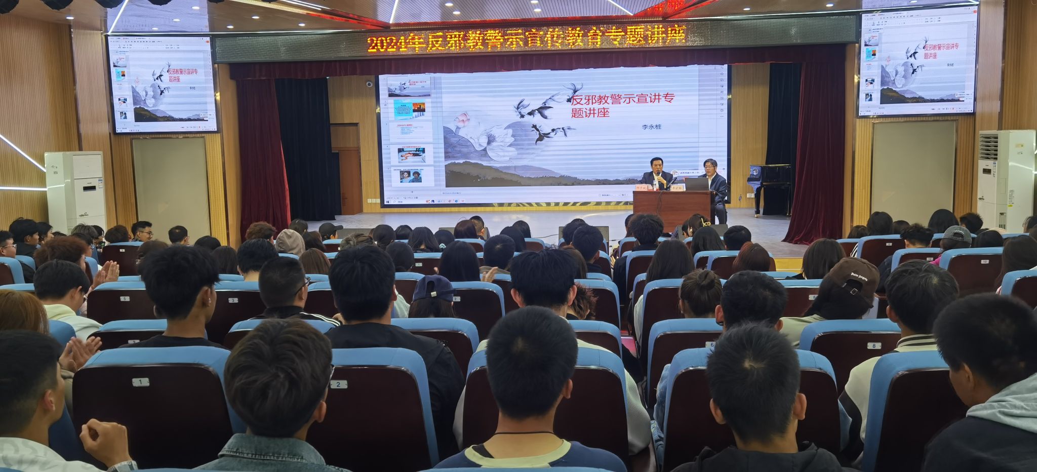 李永樁教授結合當地的生動案例,從反邪教宣講的重要意義、鄂爾多斯市反邪教基本情況以及如何識別常見邪教組織類別等方面進行講授,深刻揭示了邪教活動的欺騙性和危害性,深入闡釋了防范和抵制邪教對國家安全、社會穩定的重大意義,并告誡學生們要保持警惕,不輕易相信陌生人的言論和承諾。