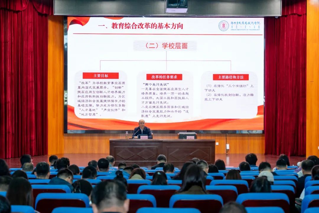 李向東以《深化改革再出發 揚帆奮進啟新程 不斷開創高水平應用型大學發展新篇章》為題,主要圍繞作為黨和國家全面深化改革的重要組成部分——教育綜合改革談為什么要學、重點學什么、學了后要干什么、為什么這樣干、怎么干等5個部分對黨的二十屆三中全會精神作了全面闡述和深入解讀,為大家更好學習貫徹全會精神提供了有力指導。