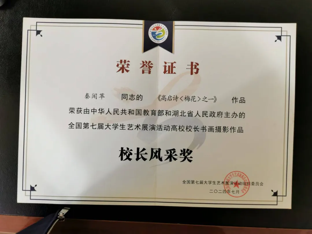 我校黨委副書記秦聞蘋同志參賽的書法作品《高啟詩く梅花>之一》,榮獲全國第七屆大學(xué)生藝術(shù)展演活動高校校長書畫攝影作品“校長風(fēng)采獎”。