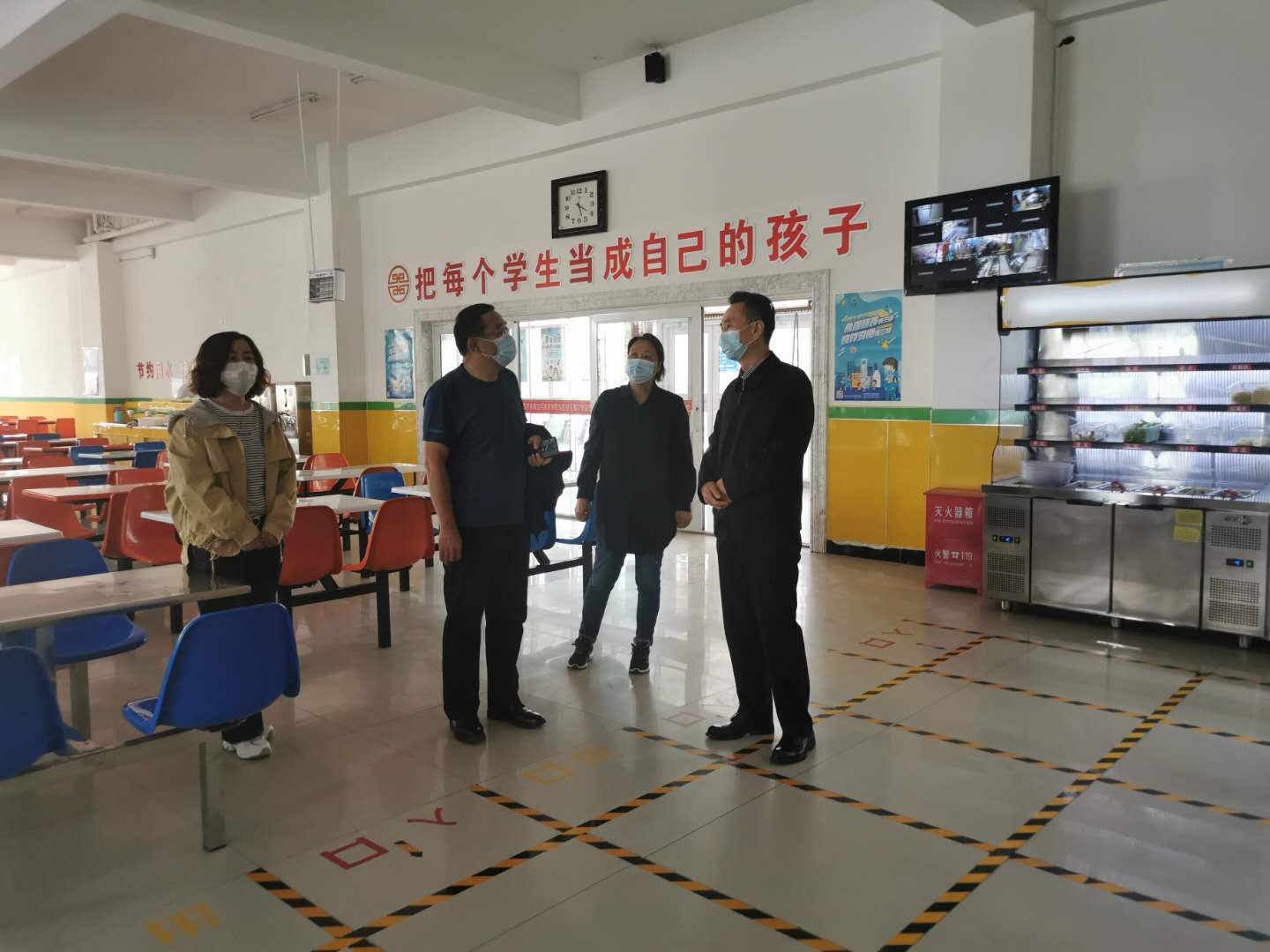在學生餐廳,侯書記與鐵院長都詳細詢問餐廳環境衛生消殺和防疫保障工作,強調要始終加強環境衛生和食品安全管理,加強對餐廳工作人員防疫消毒,保證飯菜質量。要嚴格排隊間隔距離,避免就餐聚集,確保學生用餐安全放心。