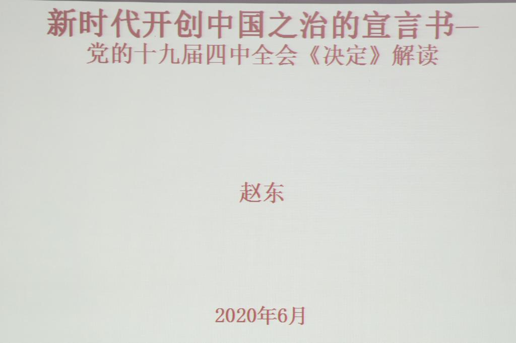 2020年6月17日上午,學院在圖書館506報告廳舉辦了領導干部學習貫徹黨的十九屆四中全會精神和全國“兩會”精神的專題講座。鄂爾多斯市委黨史研究室編研科副科長趙東應邀為我院處級、科級領導干部和黨支部書記作了題為《新時代開創中國之治的宣言書——黨的十九屆四中全會〈決定〉解讀》的專題講座。