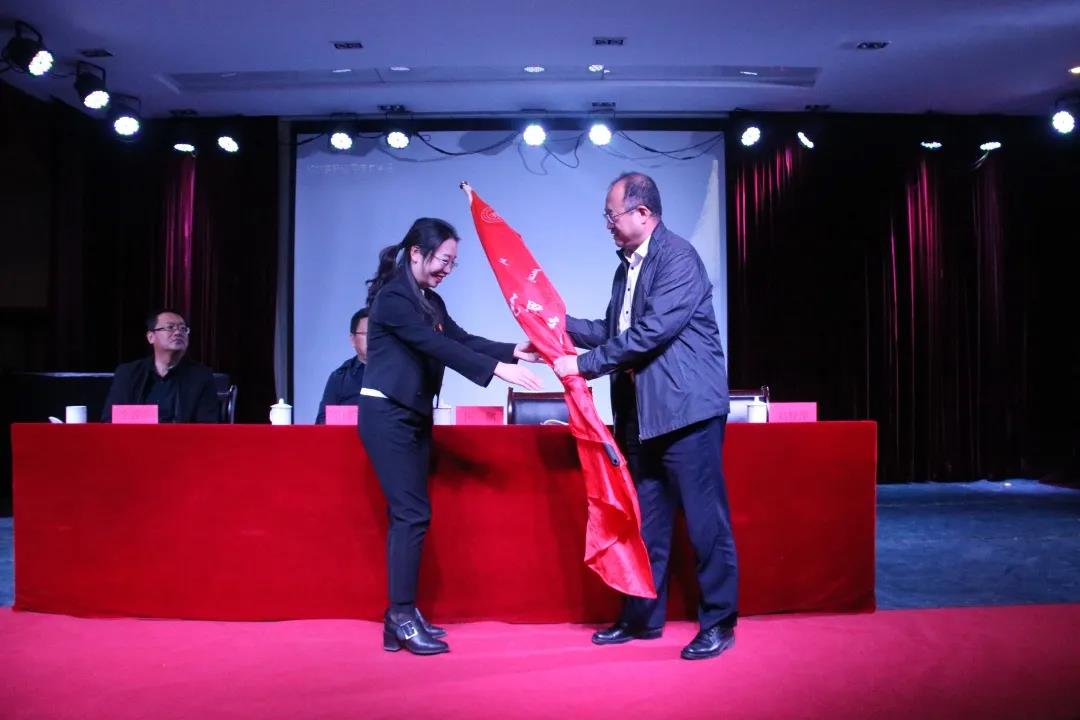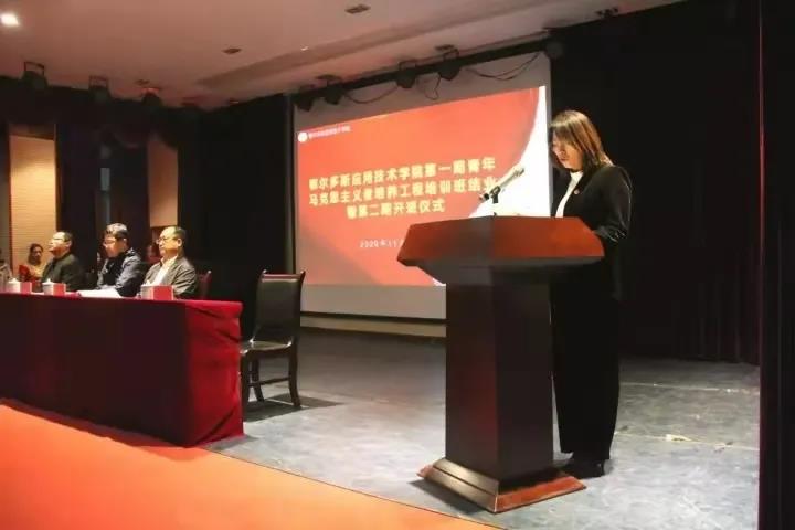 學院副院長何鵬為鄂爾多斯應用技術(shù)學院第二期青年馬克思主義者培養(yǎng)工程培訓班班主任張名老師授旗。