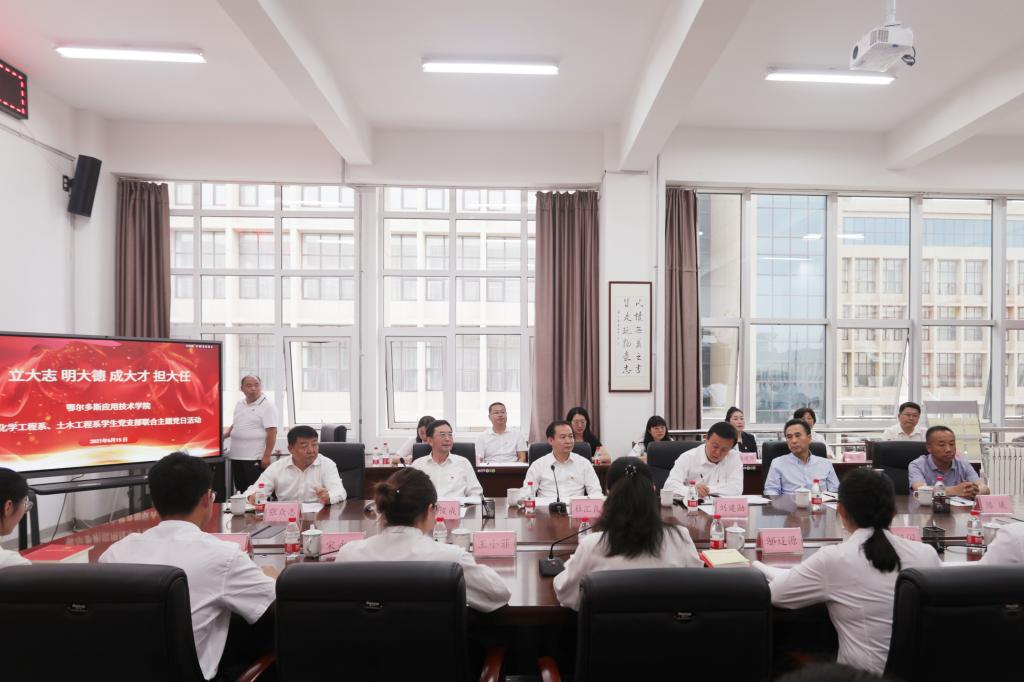 6月15日,鄂爾多斯市委副書記、市政府黨組書記杜匯良來到我院,參加化學工程系、土木工程系學生黨支部聯合開展的“立大志、明大德、成大才、擔大任”主題黨日活動,并與支部教師及學生黨員座談交流。副市長劉建勛,市政府秘書長張眾志、市委宣傳部常務副部長陳曦參加活動。