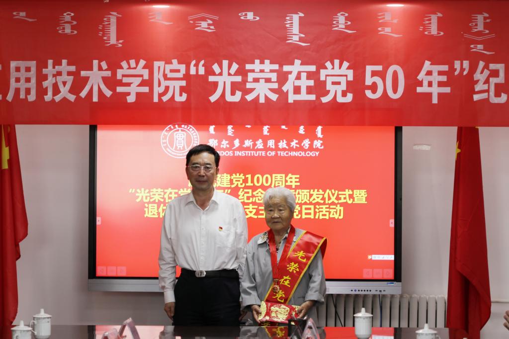 在頒獎儀式上,院領導為黨齡在50年以上的7位老黨員頒發了“光榮在黨50年”紀念章并代表學院黨委慰問了老黨員。學院黨委書記尤俊成講話,對老黨員多年來為學院發展做出貢獻、離退休后一如既往關心、支持學院的建設表達誠摯的感謝。院長鐵勇介紹了學院“十三五”期間建設發展情況,