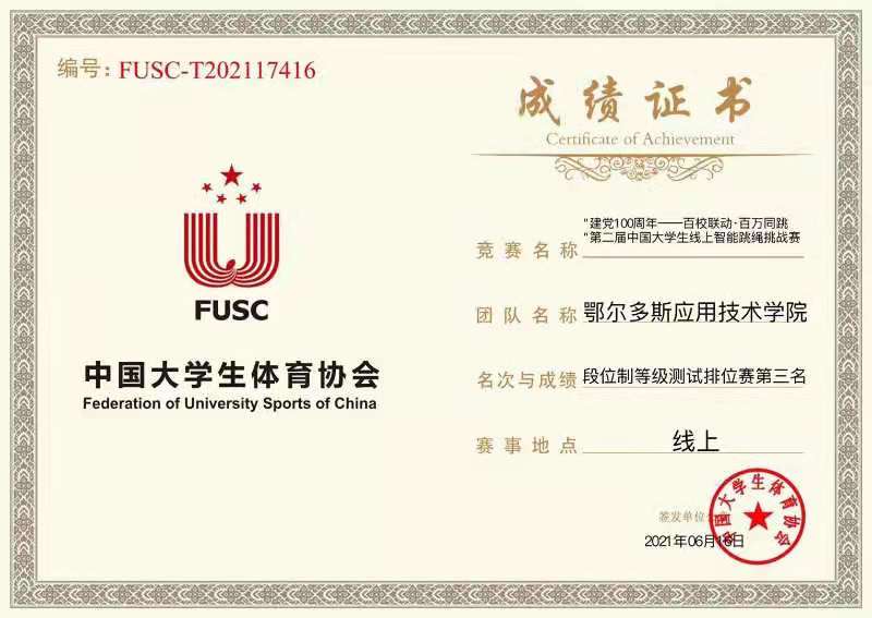 為慶祝中國共產黨成立100周年,回顧黨的光輝歷程,追溯紅色記憶,增強當代大學生對中華民族的認同感和自豪感,進一步弘揚愛國主義精神,廣泛推動全民健身運動,2021年5月10日-6月10日期間,我院參加了由中國大學生體育協會主辦的第二屆中國大學生線上智能跳繩挑戰賽,舉辦了鄂爾多斯應用技術學院第一屆“線上+線下”跳繩比賽。本次大賽以“建黨100周年——百校聯動?百萬同跳”為主題,分為打卡挑戰賽、100萬次單搖跳排位賽、中國跳繩段位制速度耐力等級排位賽三項賽事。