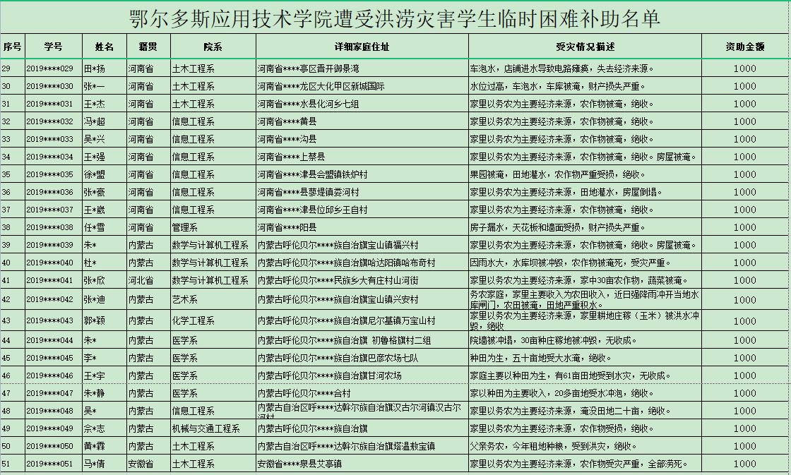 近期全國多地遭受洪澇災害,為幫助遭受洪災導致家庭經濟困難學生渡過難關,學院第一時間組織開展受災學生摸底排查和專項資助工作。經過排查,全院共有51名學生家庭受災,其中河南籍學生38人,呼倫貝爾莫力達瓦達斡爾族自治旗受災學生12人,安徽籍受災學生1人。學院為每位學生發放1000元的洪澇災害專項補助,并將根據災情發展,持續做好后續的資助工作,確保受災學生安心生活學習。