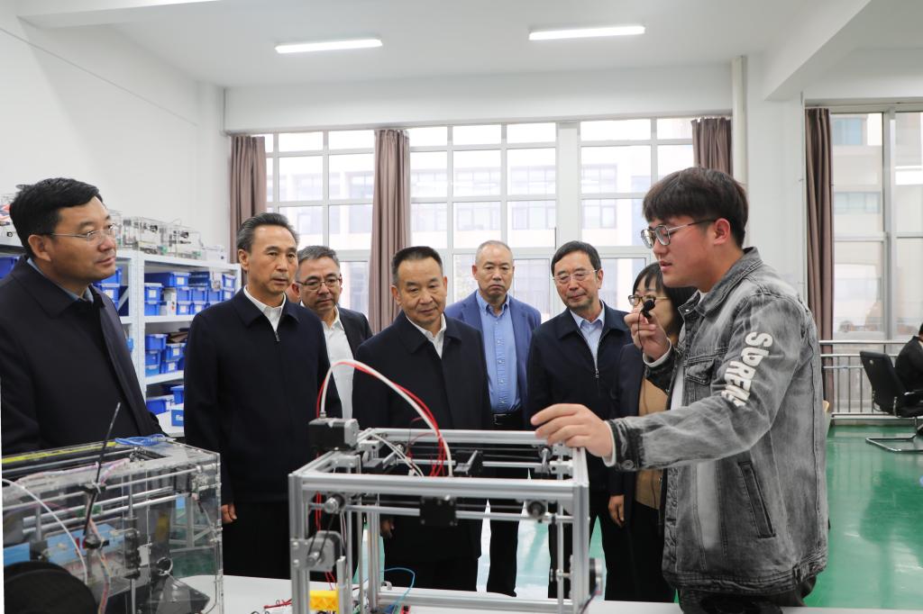 呂爾學一行實地考察航空系AOC實訓室和CBT教室,結合展板、電子屏等了解了航空簽派實訓教學過程,聽取了大飛機學院實驗實訓及產教融合情況介紹,并與正在上簽派實訓課的學生親切交流。隨后調研組一行來到智能制造實驗實訓中心,參觀了理實一體智能制造實訓室、自治區級眾創空間“云·智工坊”及學生眾創空間,在觀看學生創客作品時,呂爾學與我院師生進行了親切交談,詳細了解我院立足專業優勢開展科技創新、進行成果落地轉化等情況。考察中,呂爾學對我院堅持高標準、特色化辦學給予充分肯定,并就進一步加強政校企共建、產學研合作,促進學院高質量發展提出建設性建議。