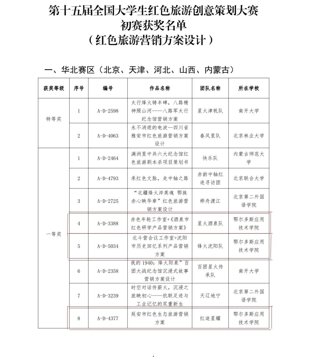 日前,第十五屆全國大學生紅色旅游創意策劃大賽初賽獲獎及入圍決賽名單公布。我校管理學院選派9支參賽隊伍與全國1001所高校6002支隊伍同臺競技,其中8支隊伍脫穎而出,榮獲華北賽區一等獎5項、二等獎3項,刷新我校參加該賽事的歷史記錄。