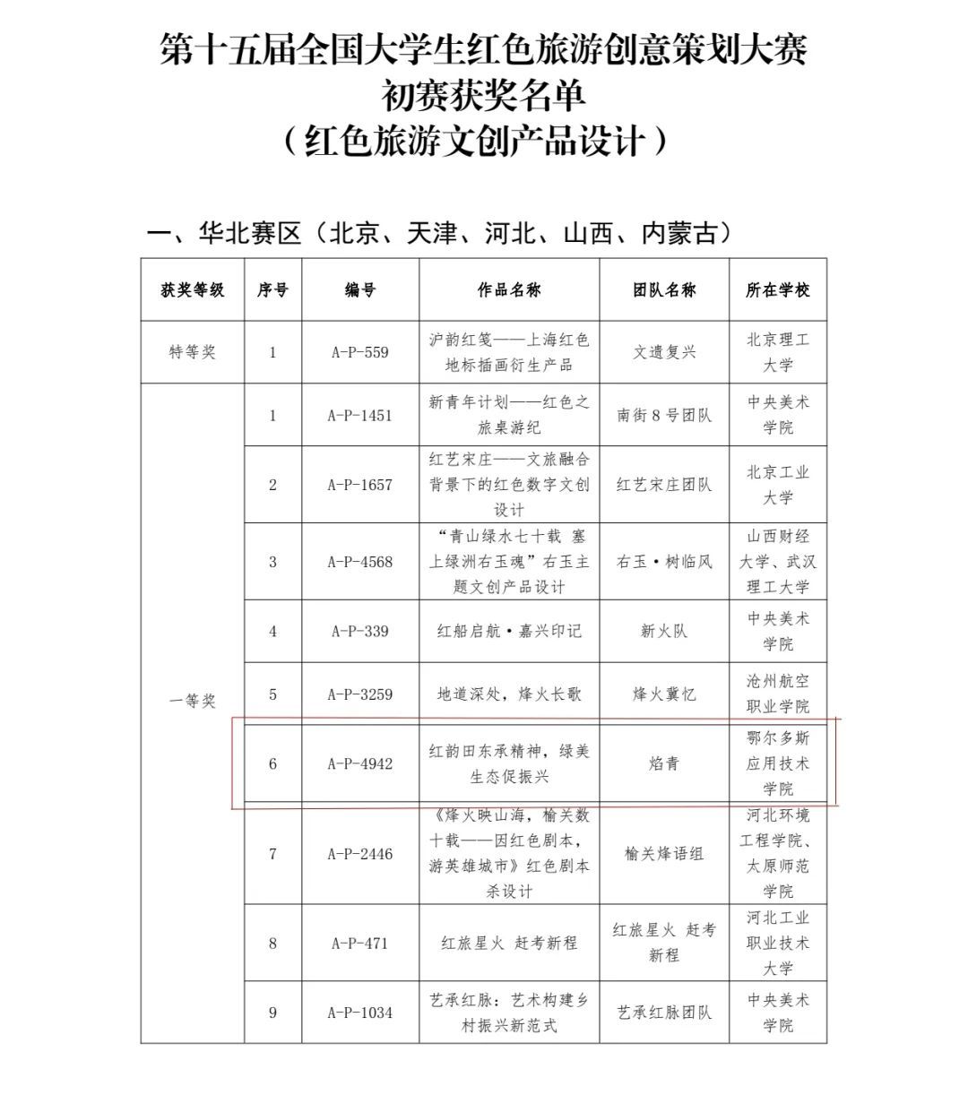 由烏尼爾、李雪松指導,2022級、2023級、2024級旅游管理與服務教育專業、2024級社會工作專業的劉夢璐等同學組成的“焰青隊”榮獲華北賽區紅色旅游文創產品設計賽道一等獎。