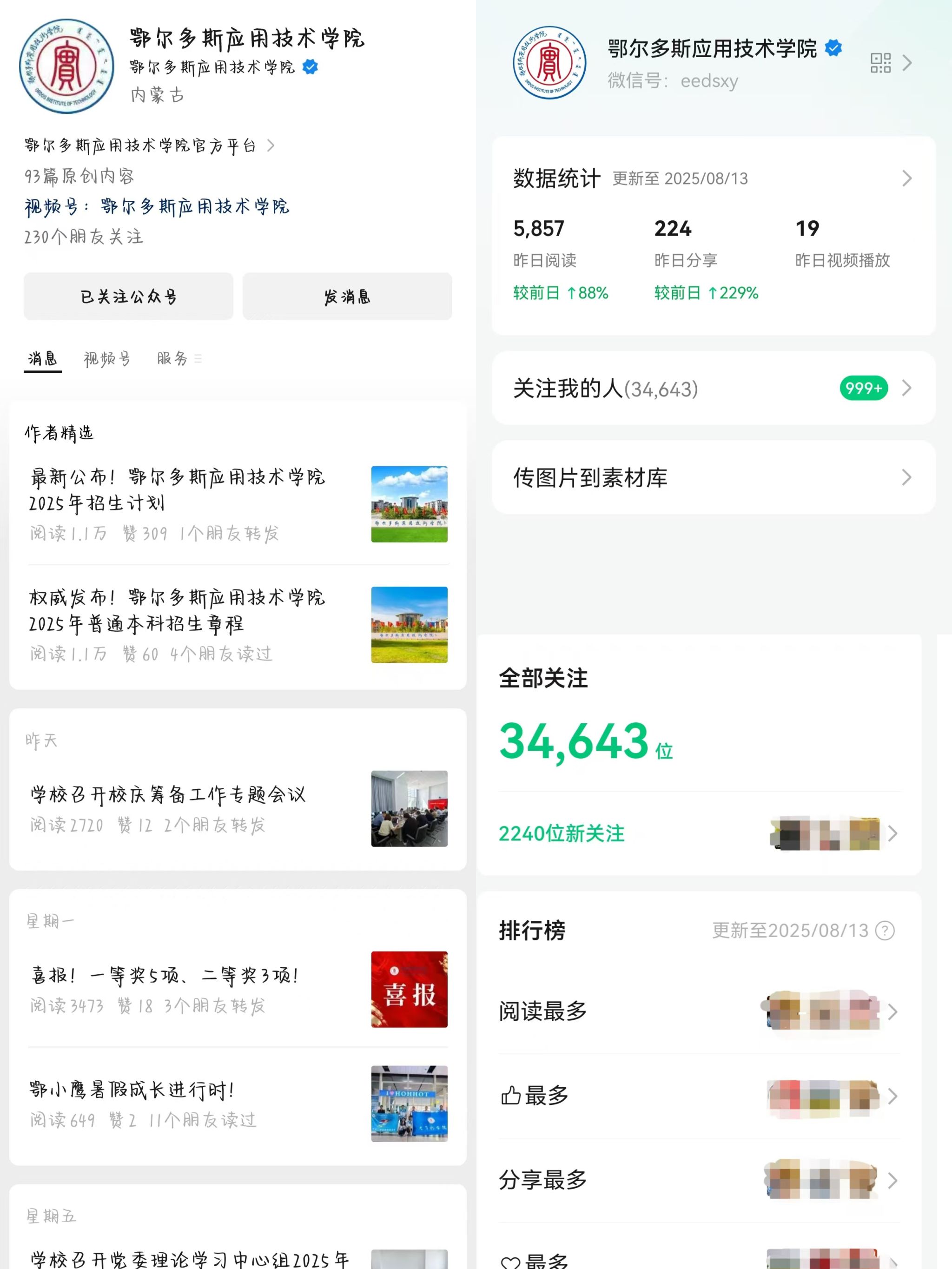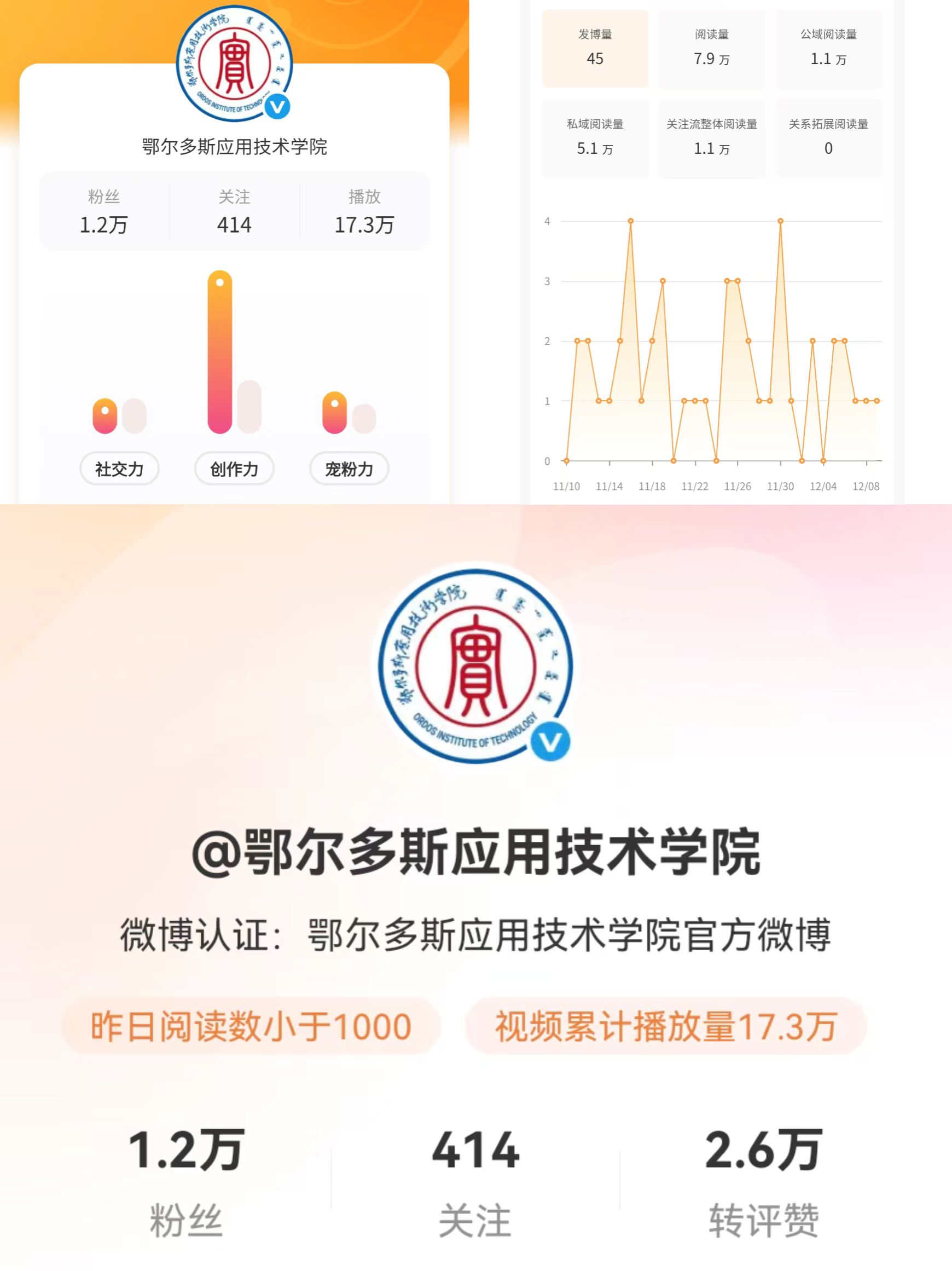 主要負責學校官方微信公眾號“鄂爾多斯應用技術學院”的日常運營工作,具體包括:為學校各類活動撰寫宣傳稿件;負責公眾號推文的選題策劃、內容編輯、視覺排版及推送發布;及時進行讀者留言互動與答疑解惑。