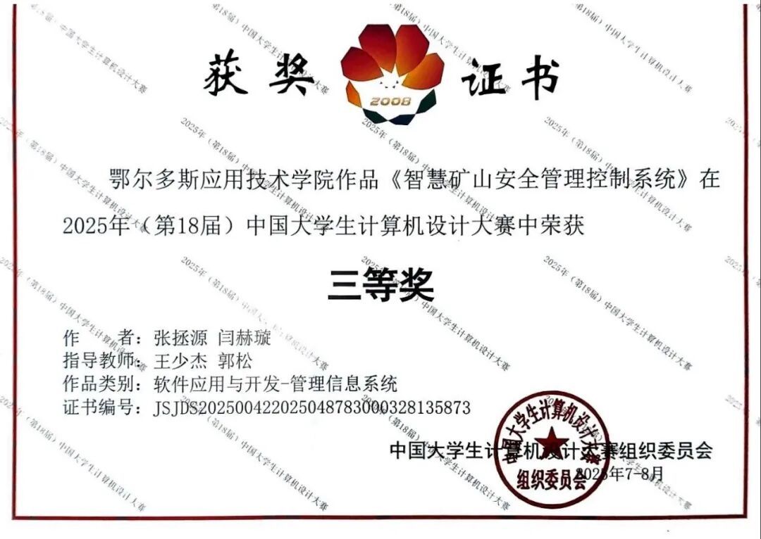 由數學與計算機工程學院教師王少杰、郭松指導,張拯源、閆赫璇兩名學生組成的團隊,憑借作品《智慧礦山安全管理控制系統》在軟件應用與開發賽道榮獲國家三等獎。該作品針對礦山安全管理難題,運用先進的計算機技術構建智能控制系統,致力于提升礦山生產的安全性與管理效率,其創新性和實用性得到了評委的認可。