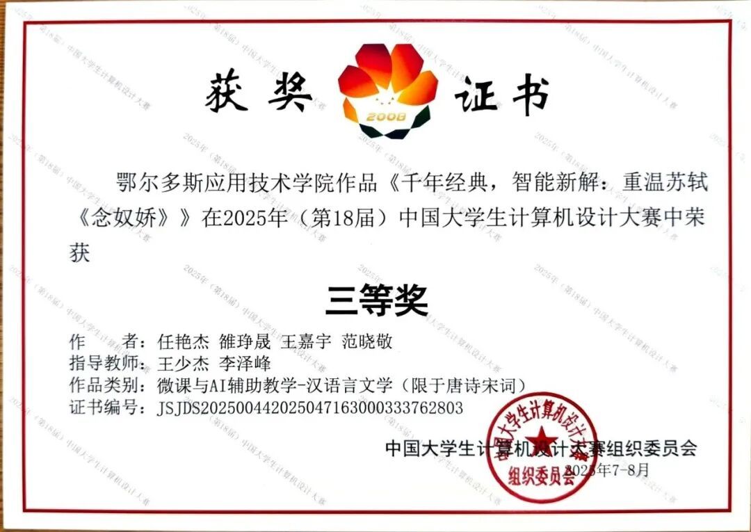 由數學與計算機工程學院教師王少杰、李澤峰帶隊,任艷杰、雒琤晟、王嘉宇、范曉敬四名學生共同完成的作品《千年經典,智能新解:重溫蘇軾<念奴嬌>》,在微課與AI輔助教學賽道中脫穎而出。該作品巧妙運用現代信息技術,對經典詩詞進行創新解讀,將傳統文化與前沿科技相結合,以新穎的視角和呈現方式,展現出獨特的魅力,榮獲三等獎。