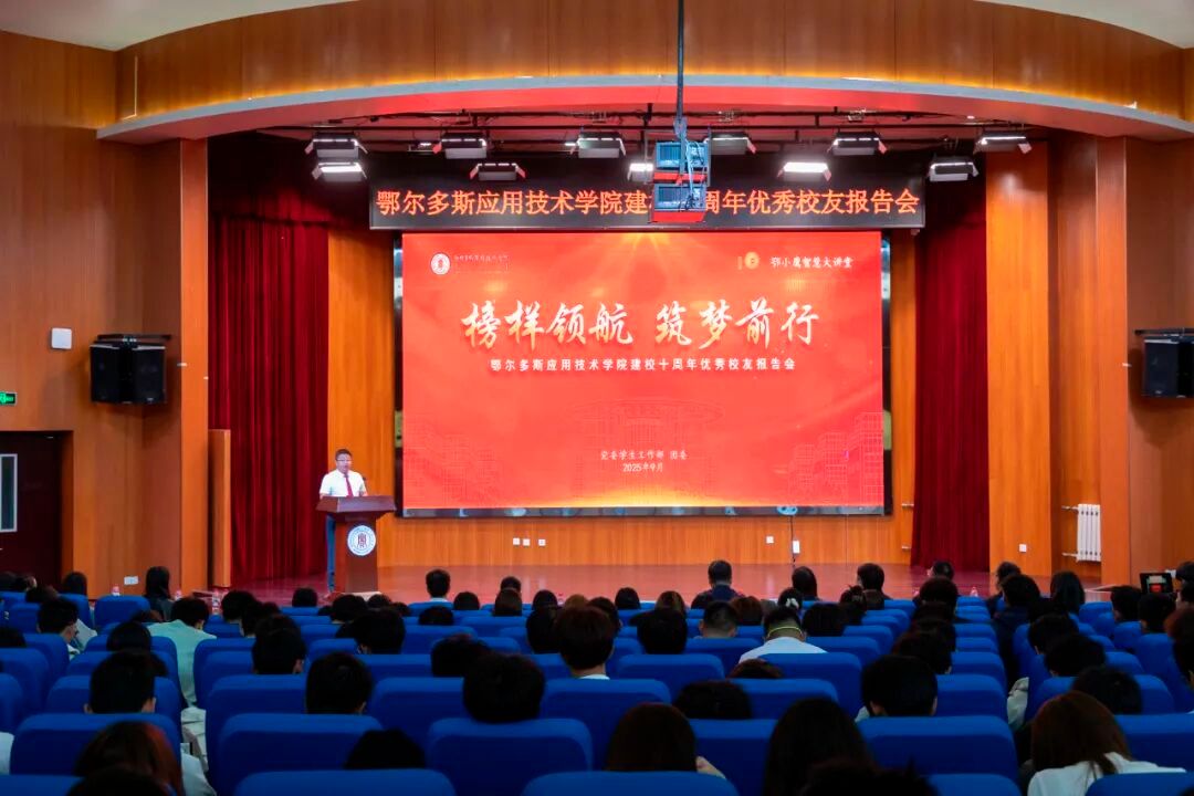 在康巴什校區(qū),全國勞動模范李曉望以“用汗水丈量人生,以感恩回饋時代”為主題,深情回顧了從“土木學(xué)子”到“快遞勞模”的不凡歷程。他將自己扎實的專業(yè)學(xué)習(xí)比作“結(jié)構(gòu)力學(xué)”,將獨闖社會的歷練總結(jié)為“人生力學(xué)”,將黨和國家的培養(yǎng)賦予的能量稱為“精神力學(xué)”。他用一串串的業(yè)務(wù)數(shù)據(jù)和一項項沉甸甸的榮譽(yù),生動詮釋了如何在平凡崗位上踐行工匠精神、書寫職業(yè)傳奇。他鼓勵學(xué)弟學(xué)妹們:“我們每個人都是自己人生的‘項目經(jīng)理’。?圖紙會修改,材料會更新,但母校教給我們的‘質(zhì)量意識’——對職業(yè)的敬畏、對社會的擔(dān)當(dāng),永遠(yuǎn)是我們最堅固的承重墻。”他的報告樸實而充滿力量,贏得了現(xiàn)場經(jīng)久不息的掌聲。